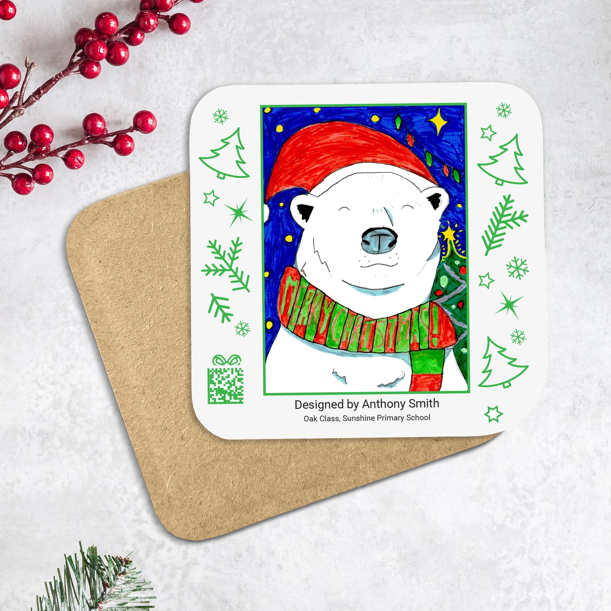 One of our most popular festive favourites, this Pack of 2 Personalised Drinks Coasters makes a thoughtful gift for family, friends, teachers or a well-deserved treat for yourself! Featuring your child’s Christmas artwork framed with a cheerful green border, these coasters add a personal, heartwarming touch to any home or office.